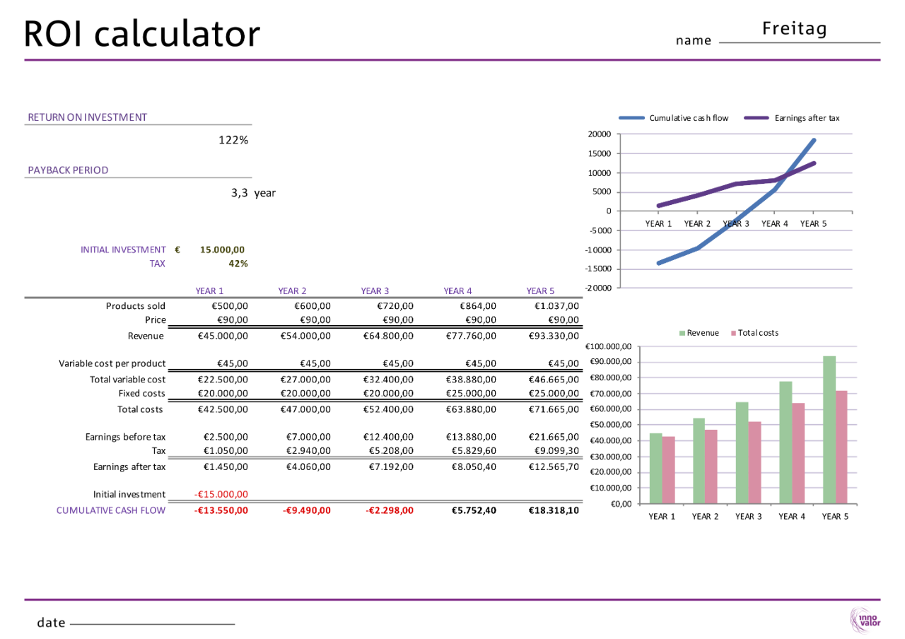 A part of your income needs to be paid to the government or state as a corporate tax, also known as income tax. This tax is applied to the net profit, so the revenue minus the costs. Enter the right tax percentage for your country or region. To get a good estimate of your return on investment you have to take the taxes into account. Write your tax percentage in the Calculator.