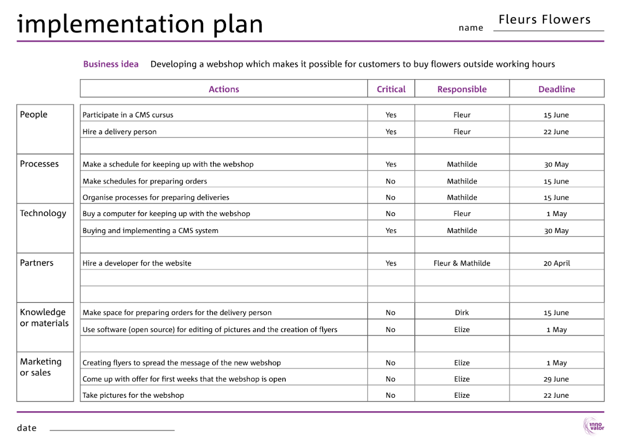 For inspiration, have a look at the example of Fleurs Flowers and learn from this application of the Implementation Plan.